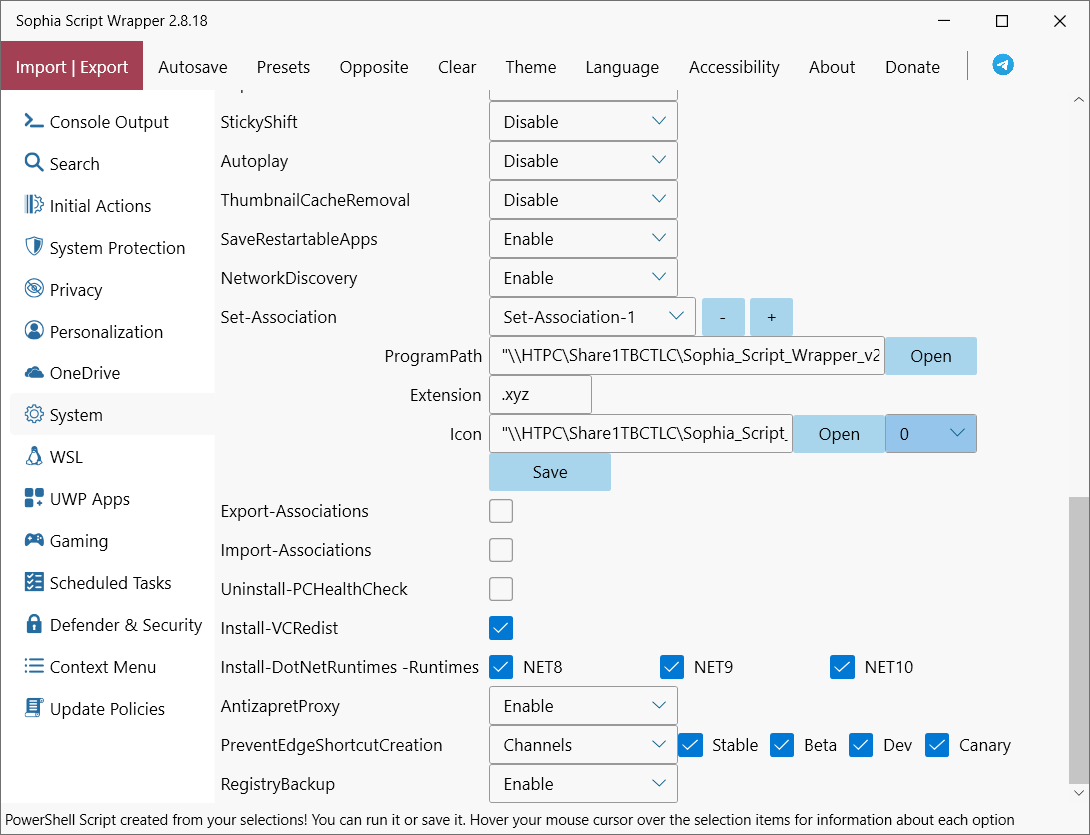 More validation for JSON added, Backup of “Sophia.ps1” to “Sophia-original.ps1” if using import ps1 file called “Sophia.ps1”, Otherwise if importing “x.ps1”, the file will be overwritten if the “Run PowerShell” button is used