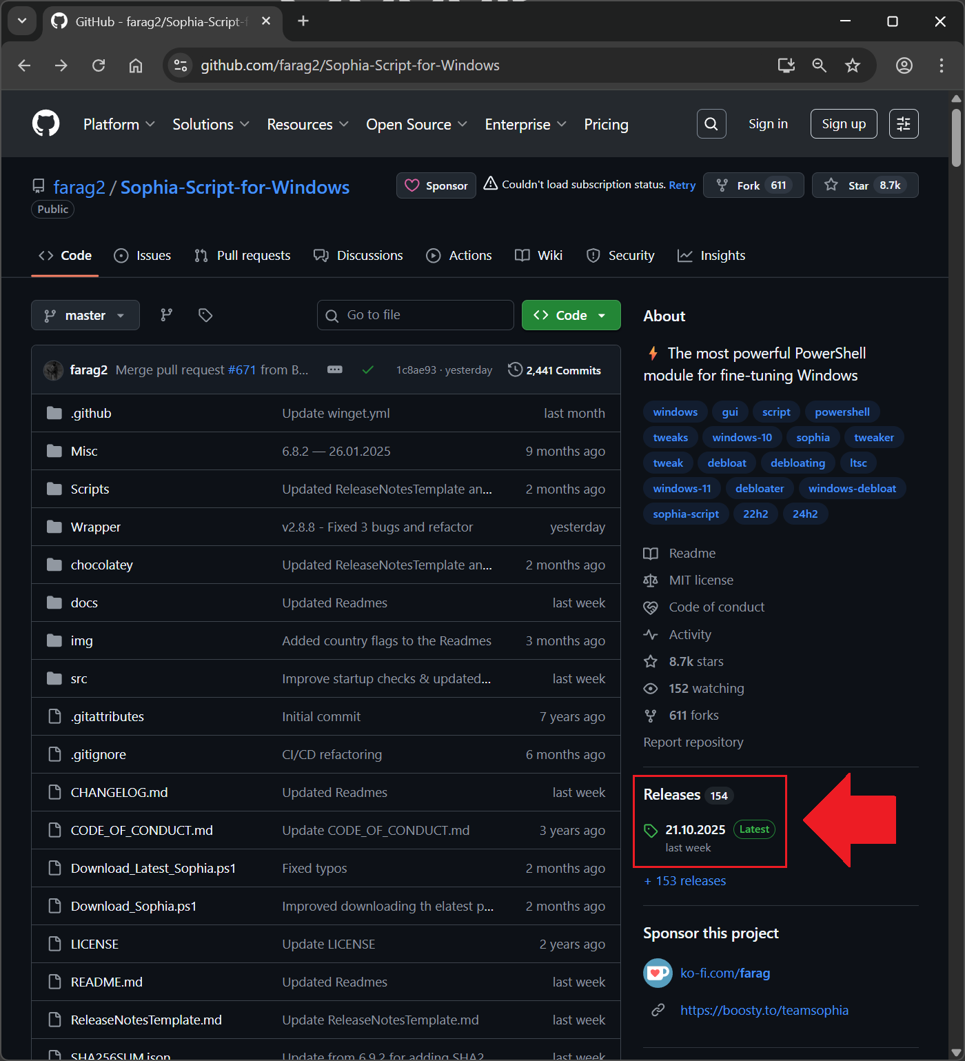 Sophia Script Wrapper can be used without installation. Navigate to the GitHub “Releases” page and download the “Wrapper” zip and appropriate “Script” zip for your Windows version.