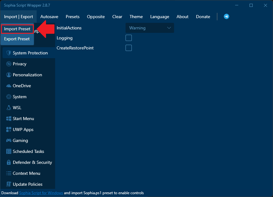 - Click “Import | Export” menu item and click “Import Preset” and browse to the “Script” folder (on Desktop for example) and open “Sophia.ps1”