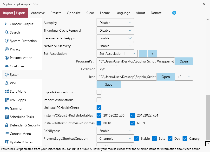 - Go to the “Console Output” to see the PowerShell script created from your selections and click the “Run PowerShell” button to execute the script. The “Run PowerShell” button creates overwrites imported “YOUR.ps1” and runs it. It makes a backup of “Sophia.ps1” called “Sophia_original.ps1” if import file is called “Sophia.ps1”.